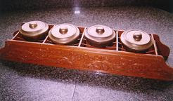 | Dibuat daripada perunggu berbentuk bulat, tepinya melengkong ke bawah, berongga di dalam dan cembul di tengah-tengah bahagian permukaannya. |